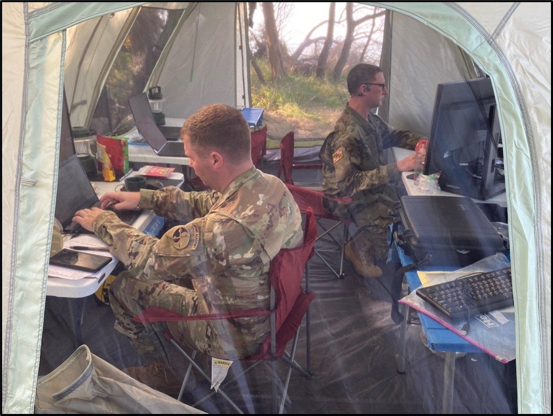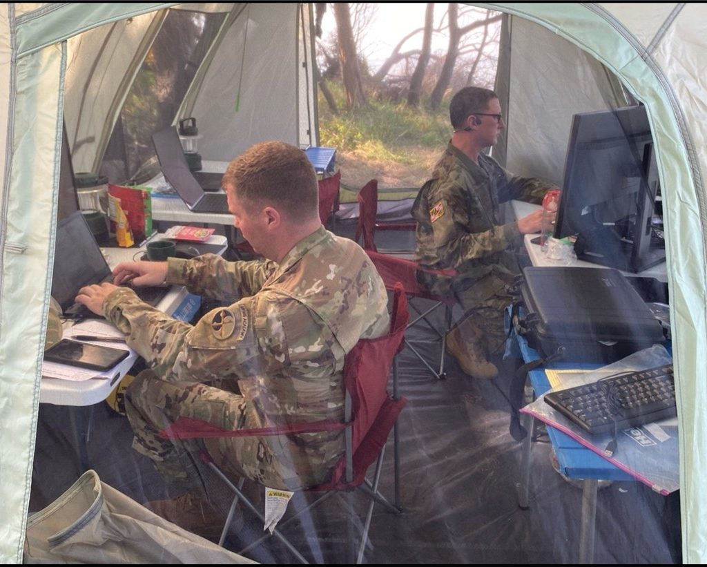 From July 11–13, 2025, Charlie Company of the 231st Troop Command established and operated an advance base camp and tactical operations center on the remote islet of Long Point, within Janes Island State Park. Working with The Maryland Department of Natural Resources they setup and built a fully functional operating base. Tents were pitched for operations and sleeping quarters, a mess kitchen was established, a generator was started, and both a sixty-foot portable radio antenna and Starlink internet connection were deployed. The camp was staffed by a commander, operations officer, communications officer, and forward observer, who together created a command and control hub to provide situational awareness, threat assessments, and communications for Delta Company and other state and local agencies participating in the exercise.