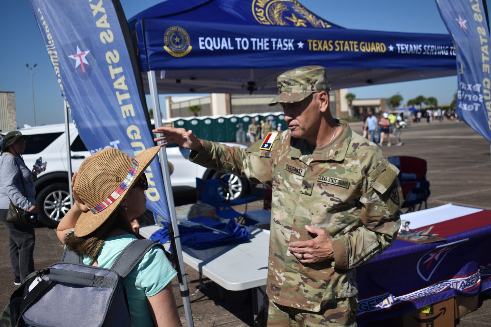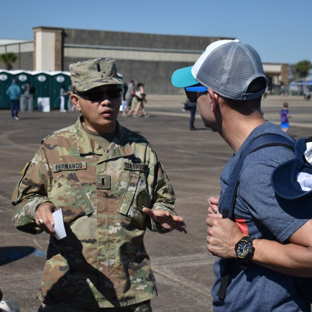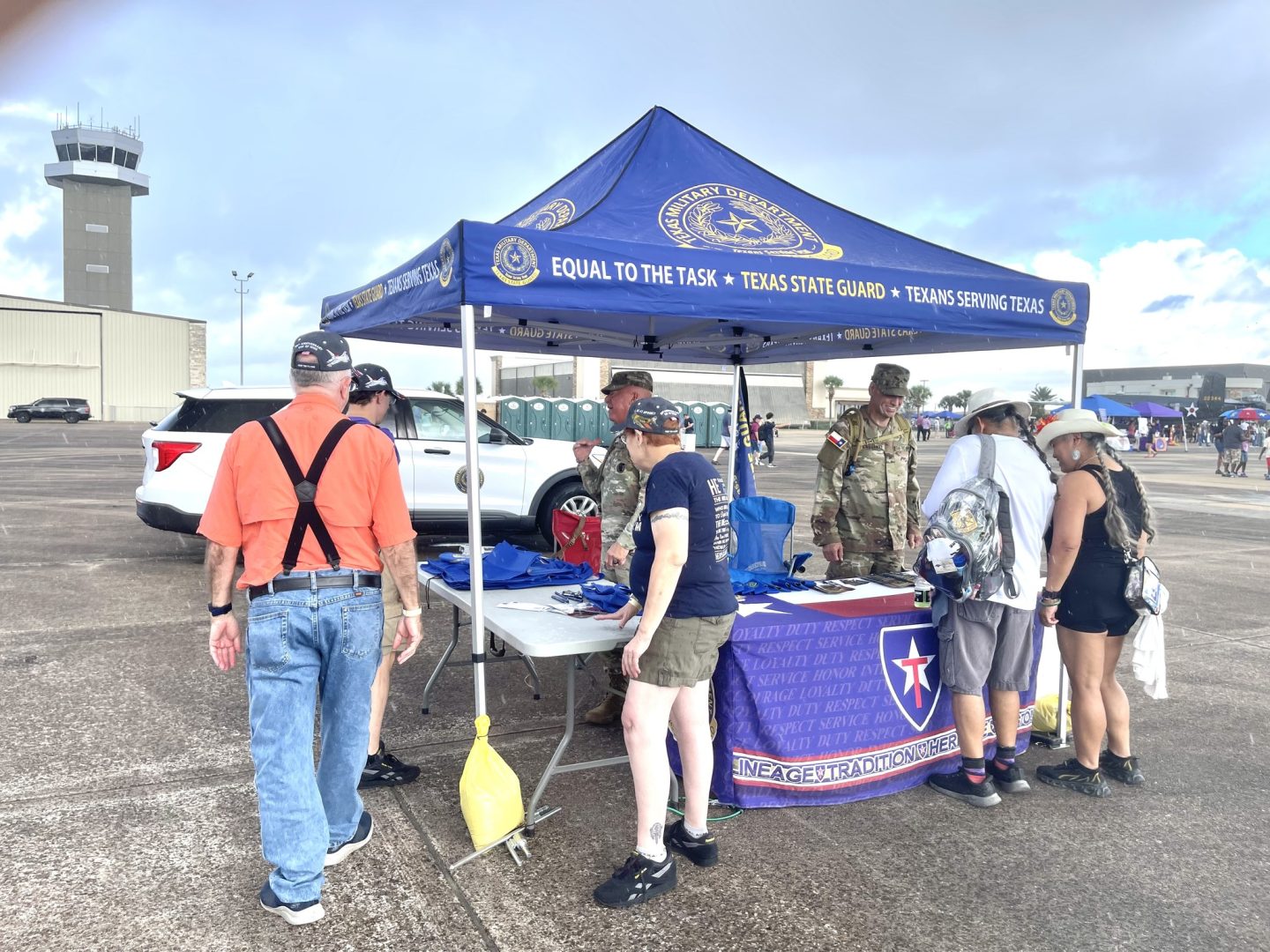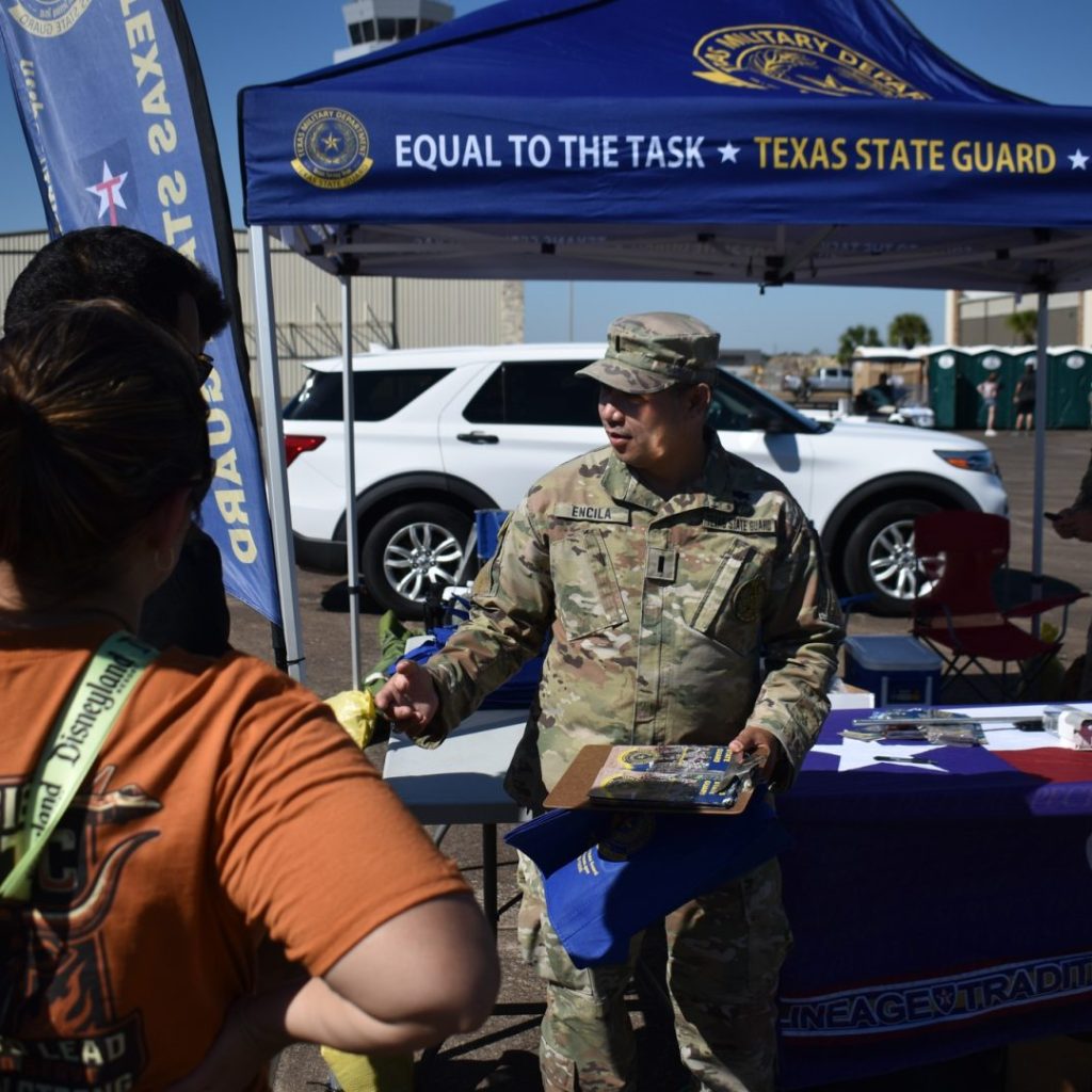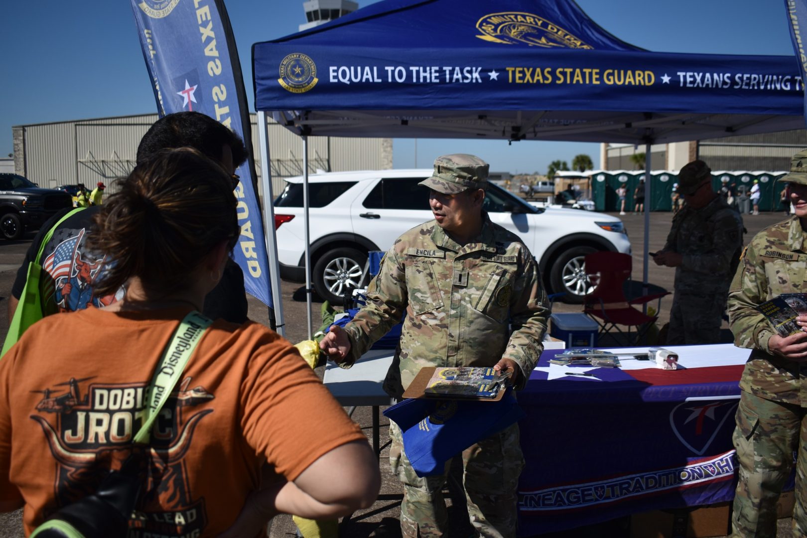 Guardsmen from the Region 2 Recruiting and Retention Unit and the Reception and Training Unit visit with attendees, educating them about the Texas State Guard, at the Wings Over Houston Airshow, Ellington Airport, Houston, Texas, Oct. 18-19, 2025. Chief Warrant Officer 2 Clinton Robinson, 1st Lts. Maynard Fernando and Francis Encila, and their recruiting team, discussed the role of the Texas State Guard, providing disaster response and support during hurricanes, floods and other emergencies. Guardsmen assist local and state authorities as needed, from providing the Emergency Tracking Network and shelter operations, to search and rescue, damage assessment and logistics support.