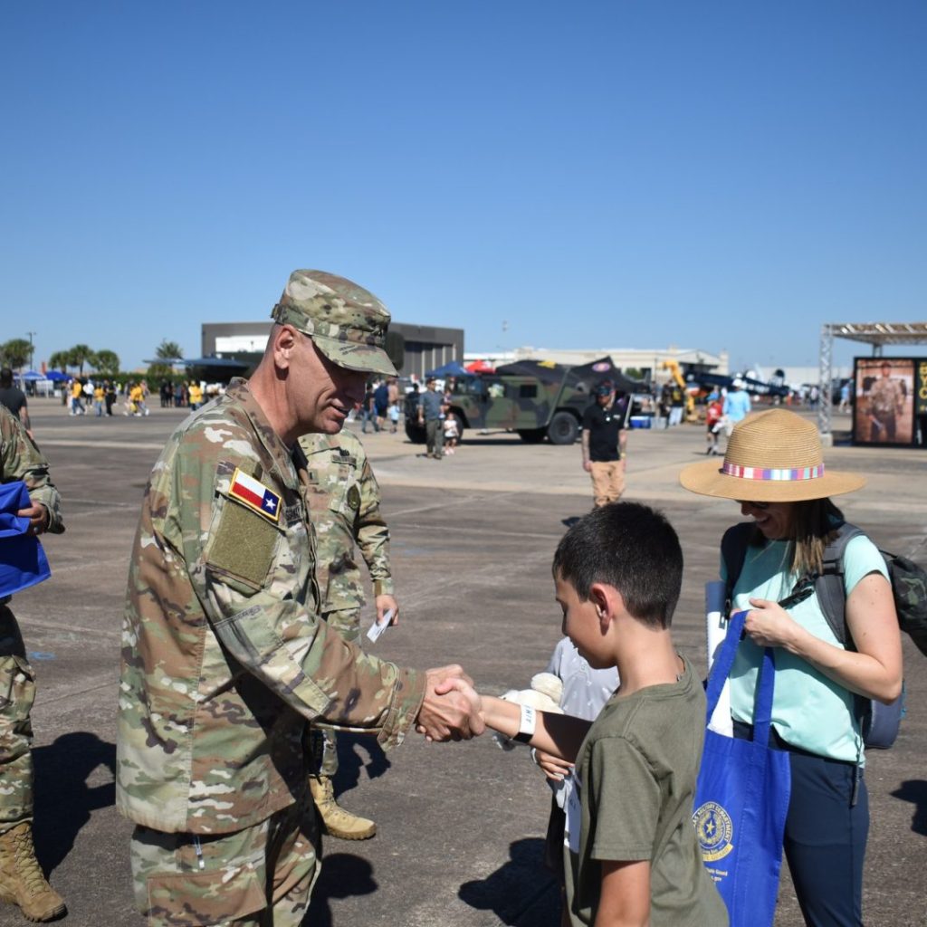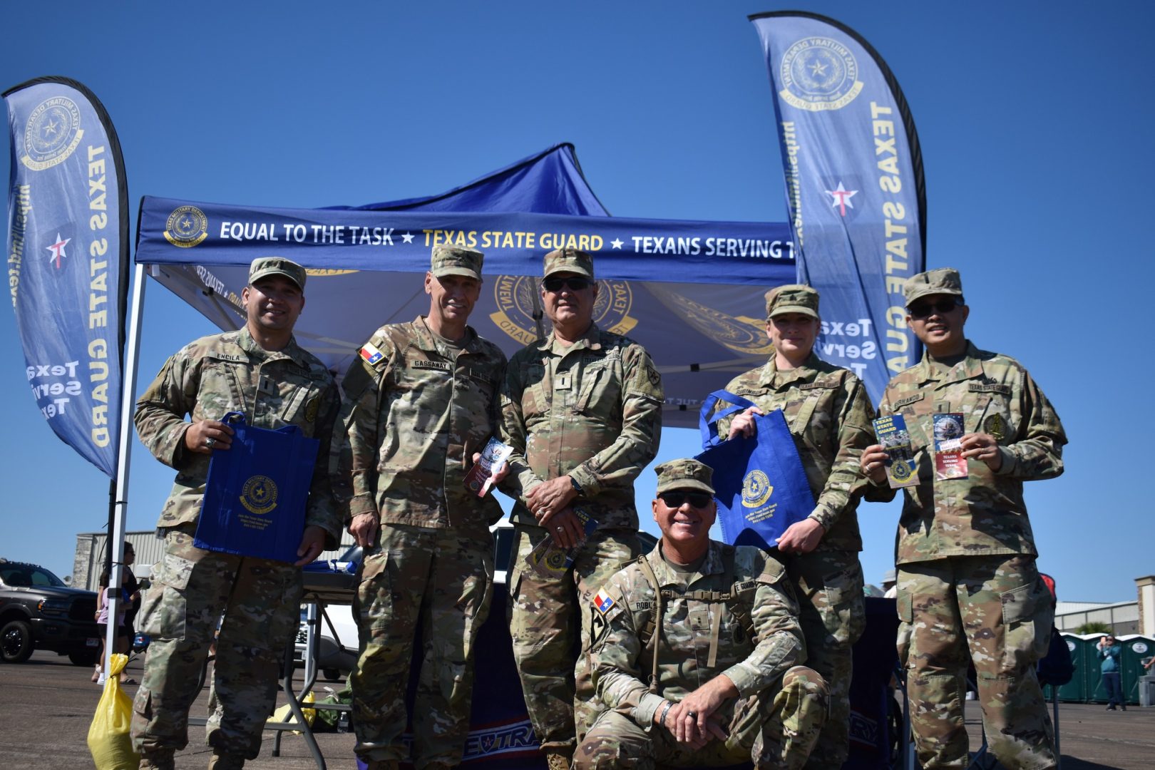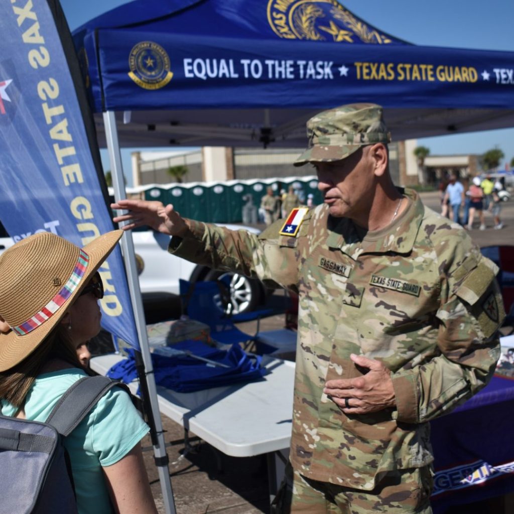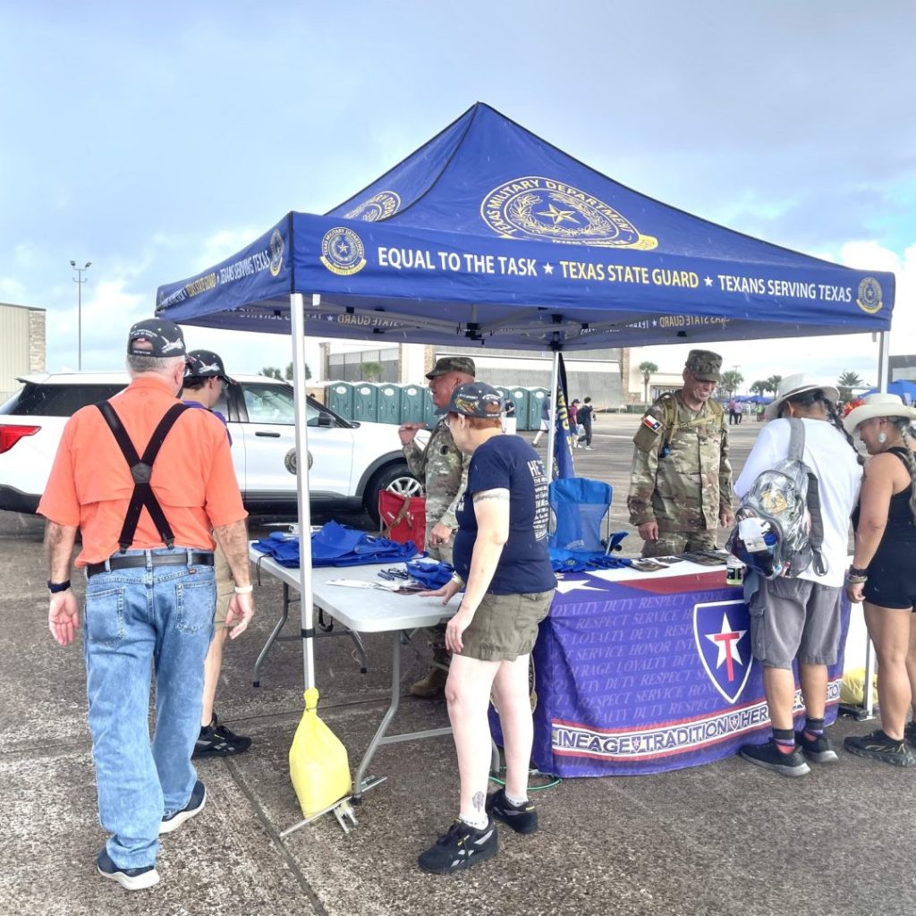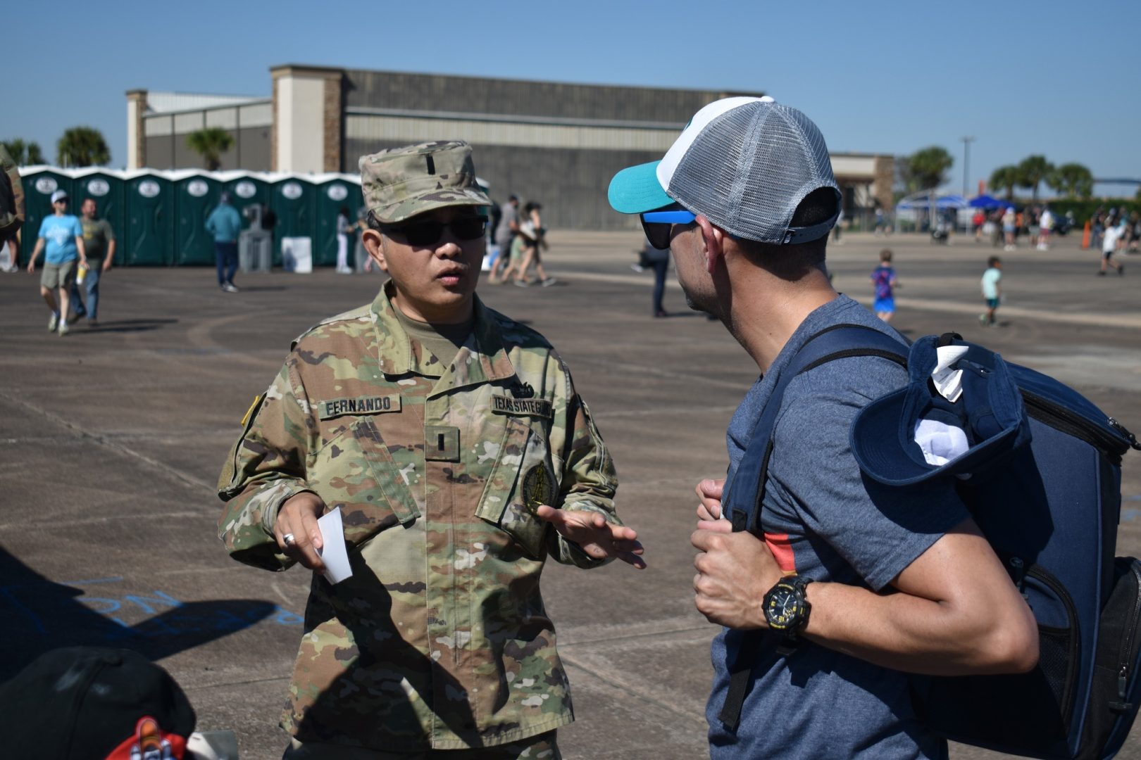 Guardsmen from the Region 2 Recruiting and Retention Unit and the Reception and Training Unit visit with attendees, educating them about the Texas State Guard, at the Wings Over Houston Airshow, Ellington Airport, Houston, Texas, Oct. 18-19, 2025. Chief Warrant Officer 2 Clinton Robinson, 1st Lts. Maynard Fernando and Francis Encila, and their recruiting team, discussed the role of the Texas State Guard, providing disaster response and support during hurricanes, floods and other emergencies. Guardsmen assist local and state authorities as needed, from providing the Emergency Tracking Network and shelter operations, to search and rescue, damage assessment and logistics support.