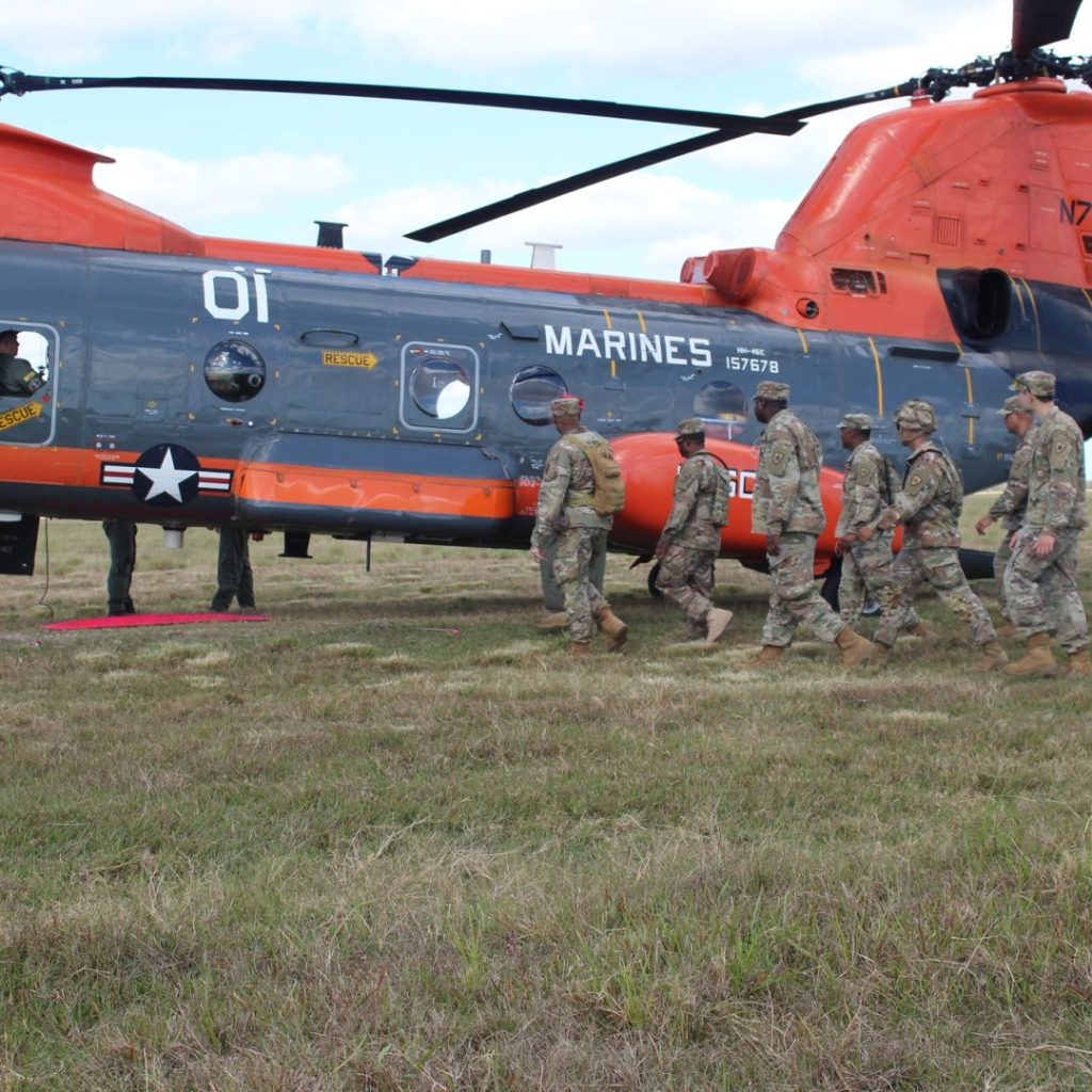 Guardsmen of 4th Battalion, 2nd Brigade, Texas State Guard, honed their skills in Search and Rescue, Land Navigation, and aeromedical evacuation support training with the assistance of National United States Armed Forces Museum personnel and their CH-46 helicopter in Angleton, Texas, Nov. 15, 2025. Guardsmen also reinforced their basic first aid skills, practiced loading and unloading patients and learned to prepare an ad hoc landing site as would be utilized in a natural disaster or other emergency. Thank you to our valued agency partners without whom such an exercise would not be possible. These field exercises develop and strengthen the skills needed to assist as needed during natural disasters and other emergencies. 2nd Brigade is ad omnia parati, “Ready for Anything!” (Texas State Guard photos by Chief Warrant Officer 2 Willie Grimes)
