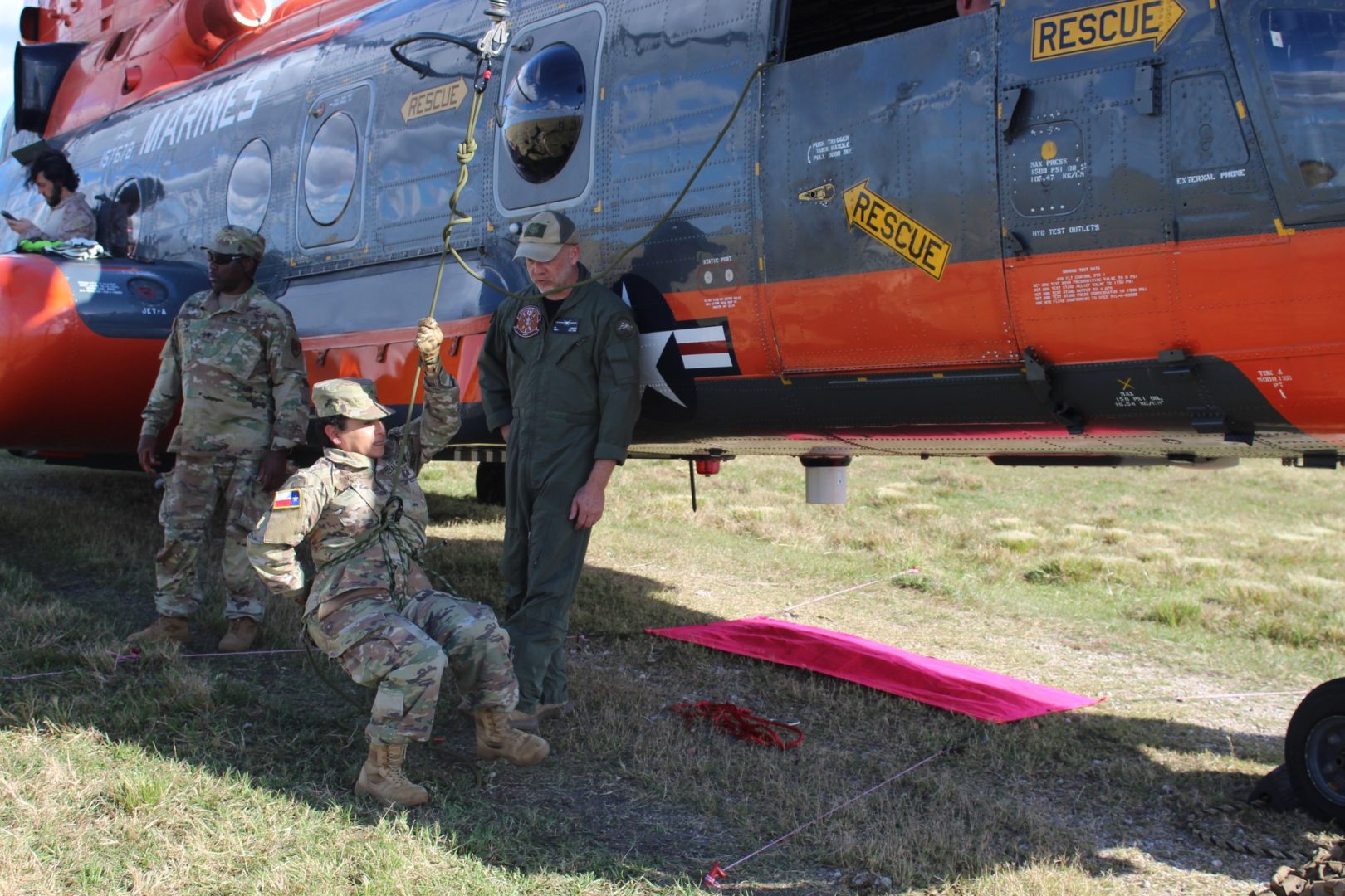 These tasks were reinforced by refresher sessions in land navigation, ensuring that Guardsmen maintain the ability to traverse unfamiliar and rugged terrain without relying on digital tools that may fail during an emergency. This Search and Rescue training was supported by personnel from the National United States Armed Forces Museum. Working with the museum’s CH-46 helicopter in Angleton, Texas, Guardsmen of the 4th Battalion strengthened their ability to operate alongside aviation assets, practicing patient loading and unloading and learning how to create improvised landing zones—an essential skill during hurricanes, tornadoes, flooding, or any emergency where the landscape has been drastically altered. These exercise offer realistic, hands-on experience that closely mirrors the conditions the Texas State Guard encounters during statewide deployments.