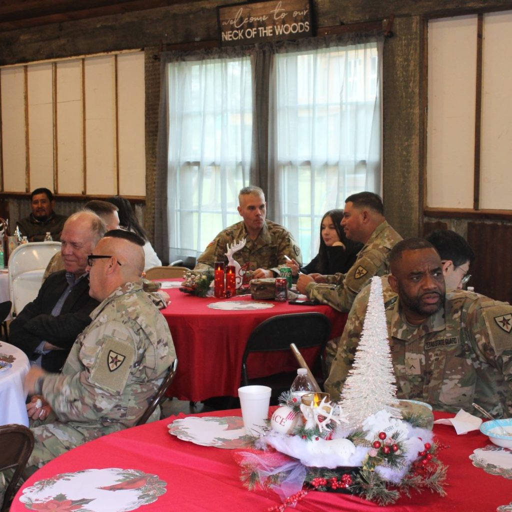 Guardsmen of 4th Battalion, 2nd Brigade, Texas State Guard, and their families, enjoy their annual Holiday Party in Alvin, Texas, December 6th, 2025. After a successful and productive year on various missions and training opportunities, it was important to take time to enjoy home cooking and the company of fellow guardsmen and their family members who provide vital support. Additionally, Maj. Kenneth Bergeron, Commander, 4th Battalion, promoted Ryon Bell to Private First Class, and, along with 1st Sgt. Pedro Sosa, presented a special certificate to Command Sgt. Maj. John Marshall, former CSM for 2nd Brigade, commemorating his decades of service to Texas and invaluable contribution and support to leadership and the enlisted troops of 2nd Brigade and the 8th Regiment, its predecessor. Well done all, and Happy Holidays! (Texas State Guard photos by Chief Warrant Officer 2 Willie Grimes)