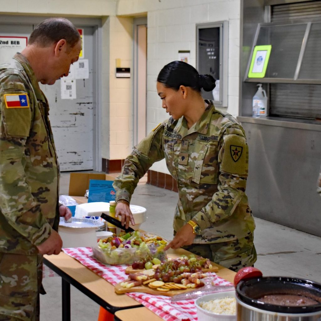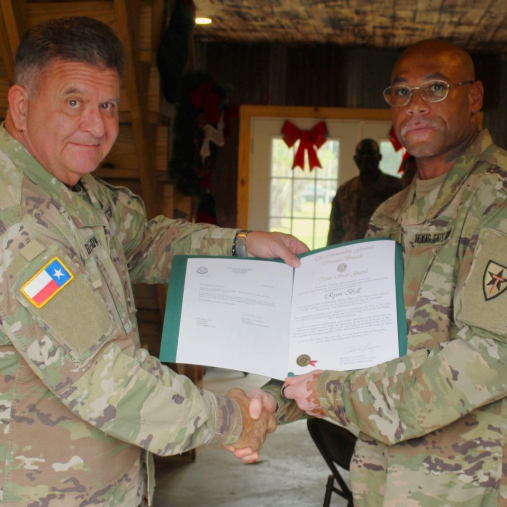 Alongside the celebration, the units took time to formally recognize service and achievement. Major Kenneth Bergeron promoted Ryon Bell to the rank of Private First Class, while Command Sergeant Major John Marshall, former Command Sergeant Major of 2nd Brigade, was presented a special certificate commemorating decades of dedicated service to Texas. The recognition, supported by 1st Sergeant Pedro Sosa, underscored the importance of honoring leadership, experience, and the legacy passed down to the next generation of Guardsmen.