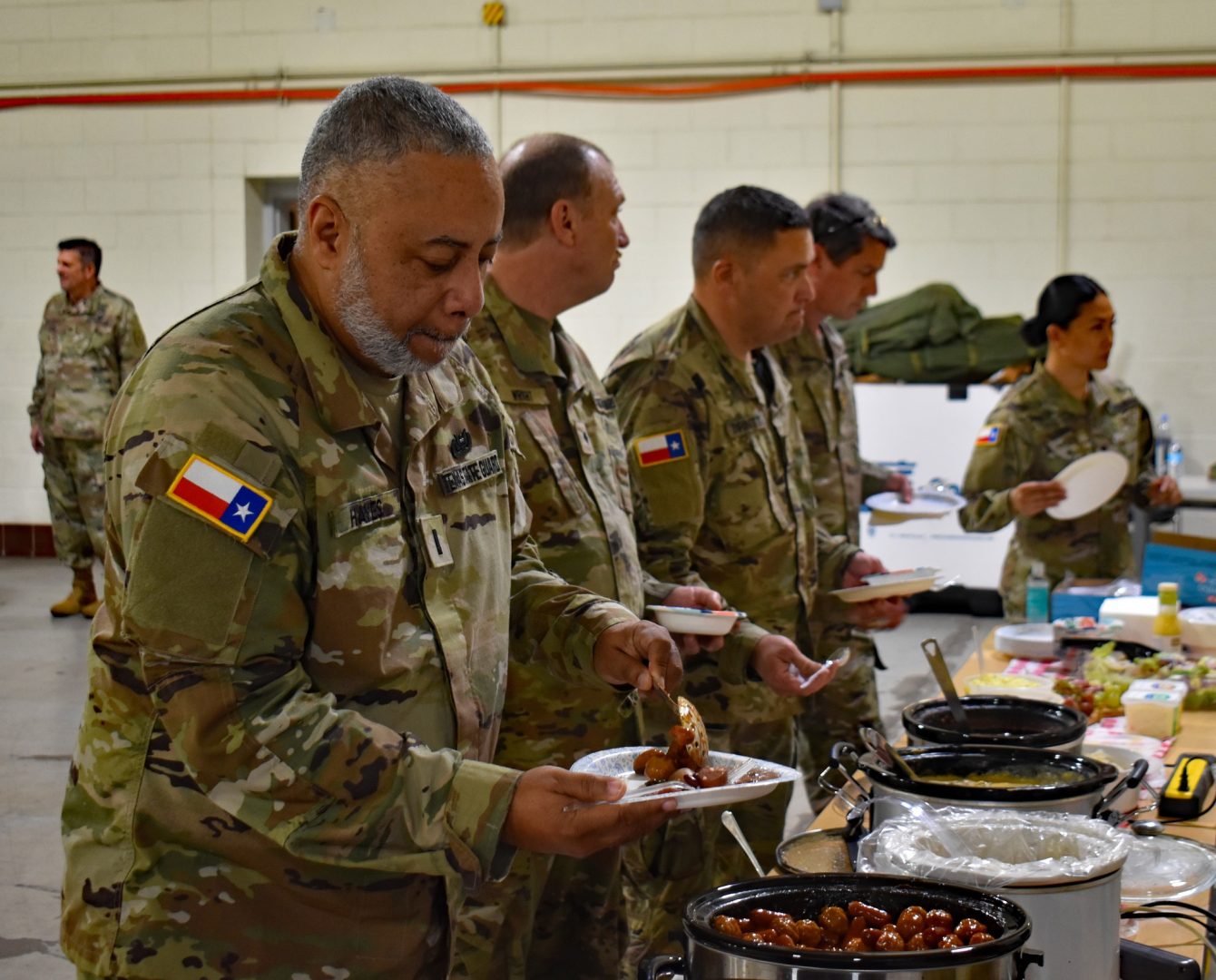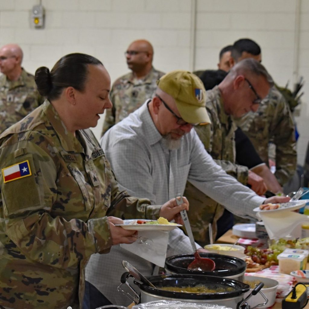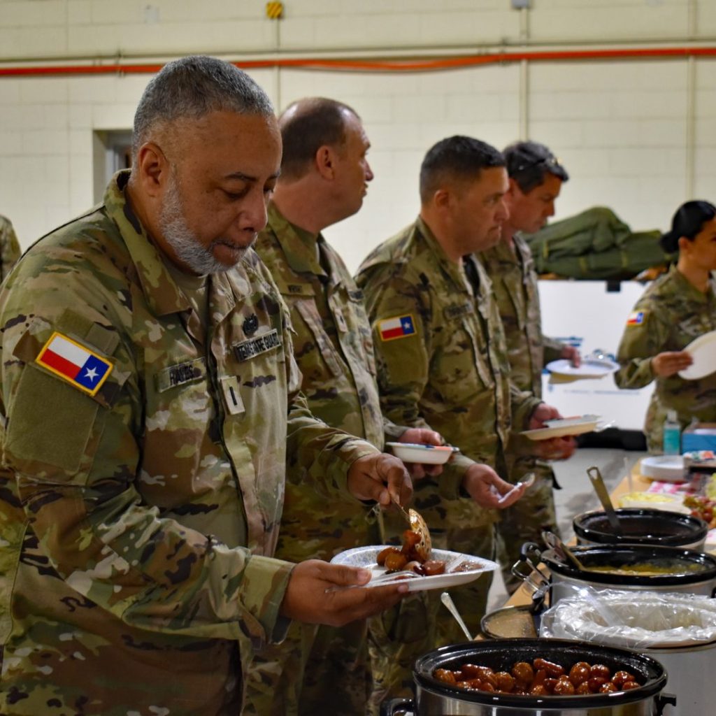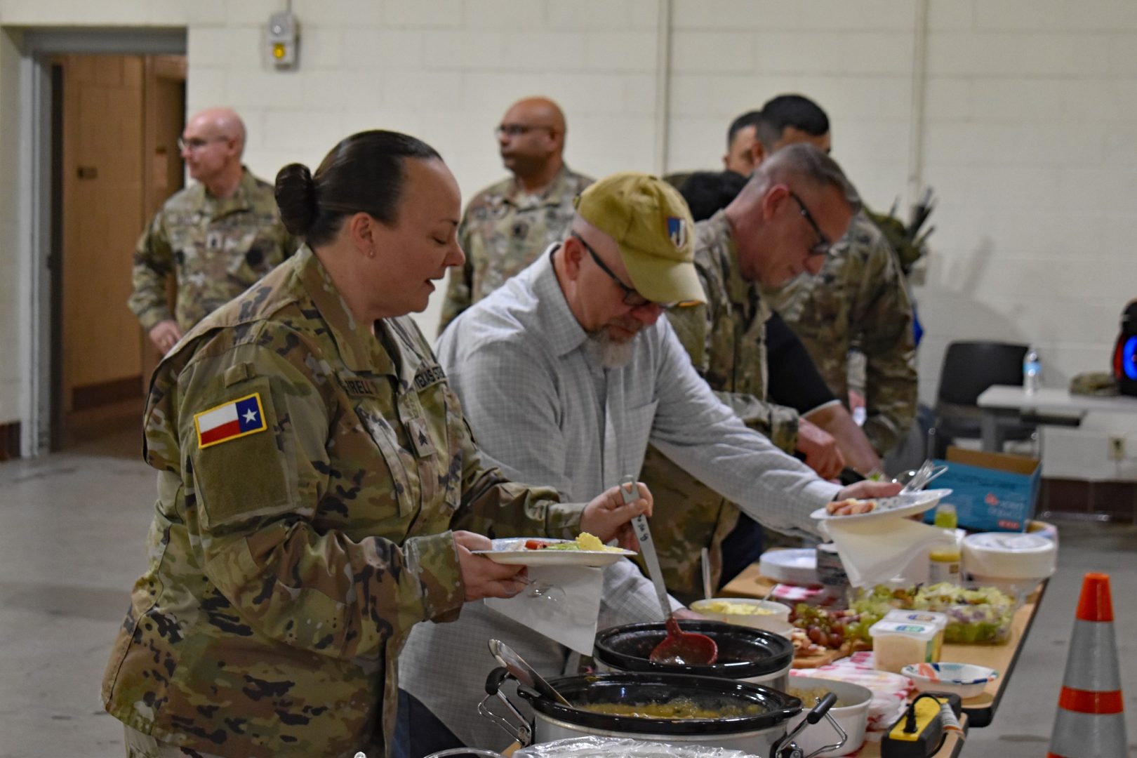Guardsmen of Headquarters, 2nd Brigade, Texas State Guard, enjoy a holiday potluck meal and celebration at the Texas National Guard Amory, Houston, Texas, Dec. 13, 2025. After a successful and productive year with various missions, training opportunities, and welcoming new leadership in June, it was important to take time to enjoy home cooking and the company of fellow guardsmen and their family members who provide vital support all year. Well done all, and Happy Holidays! (Texas State Guard photos by Chief Warrant officer 2 Gregory Illich)