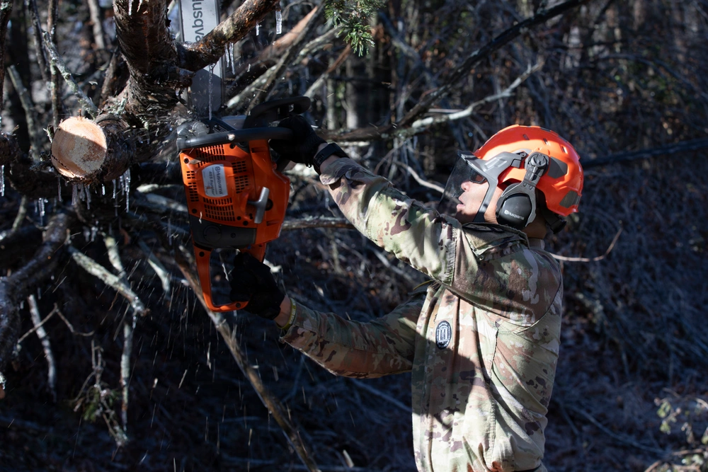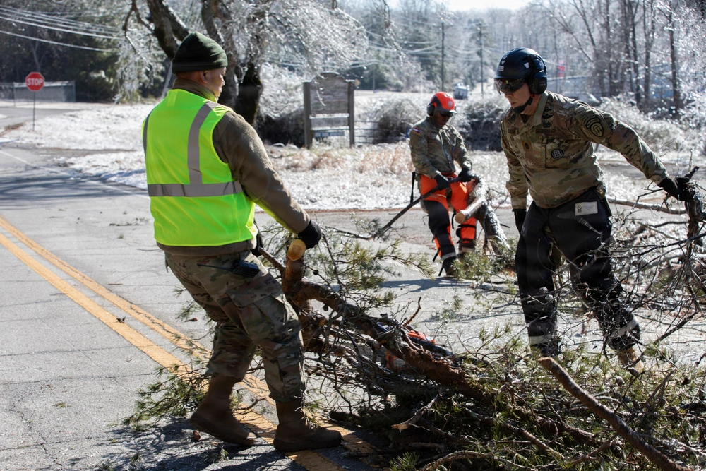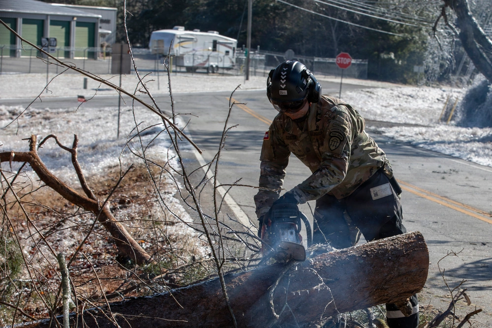 In Georgia, the response to Winter Storm Fern demonstrated a coordinated, multi-component effort by the Georgia Department of Defense. Following a state of emergency declaration by Governor Brian Kemp, the Georgia State Defense Force (GSDF) and the Georgia National Guard were activated to address icy roadways, fallen trees, and widespread power outages across North Georgia. Volunteers from the 878th Engineer Battalion and GSDF rapidly transitioned from scheduled training to full mission execution, pre-positioning equipment and personnel ahead of worsening conditions. Debris clearance teams worked county by county to reopen critical routes, while senior GSDF members provided on-the-spot training in chainsaw operations and safety to ensure new volunteers could operate effectively in hazardous environments. Together, Soldiers, Airmen, and State Defense Force troops traveled hundreds of miles, cleared dozens of routes, and restored access to isolated communities, underscoring the value of joint state military operations during domestic emergencies.