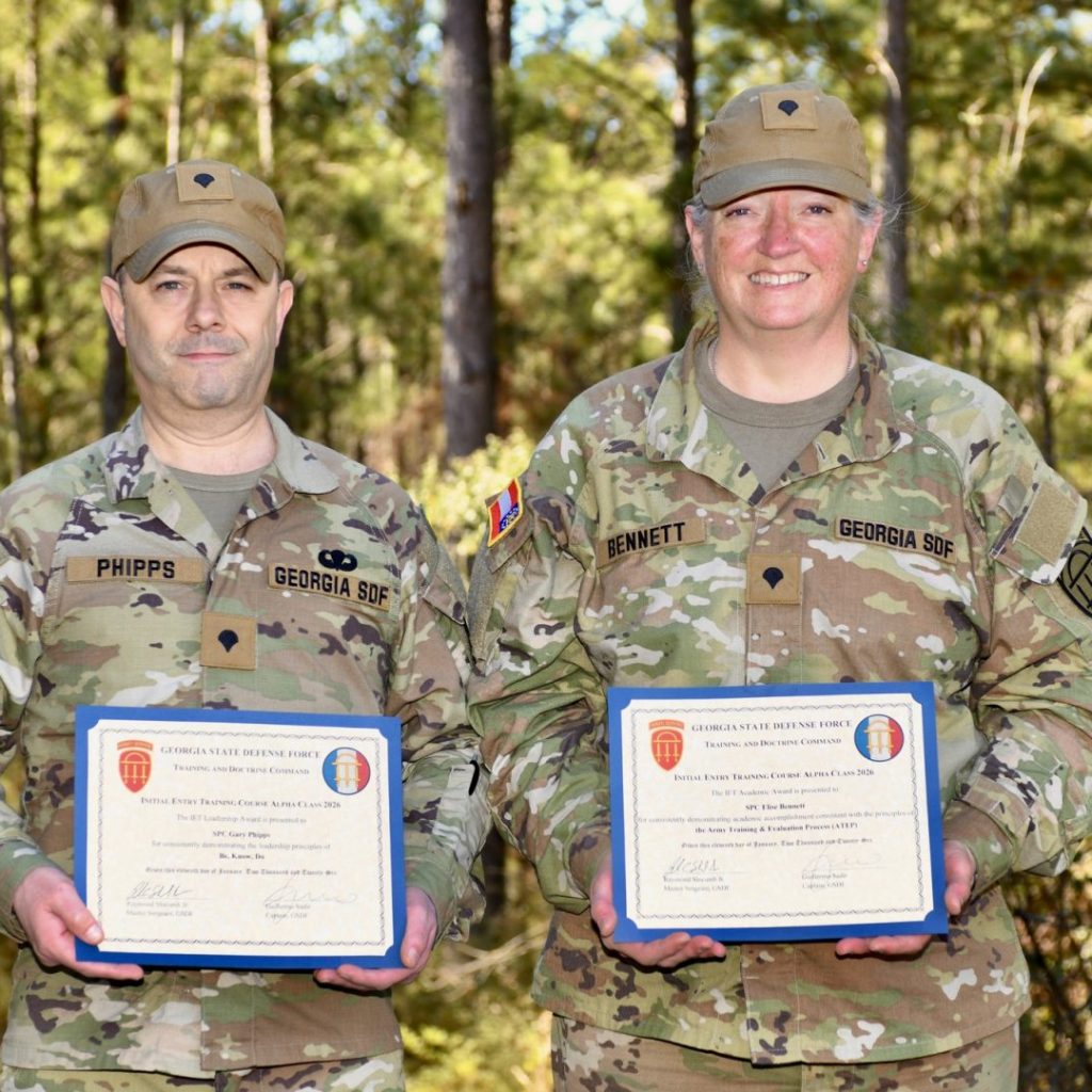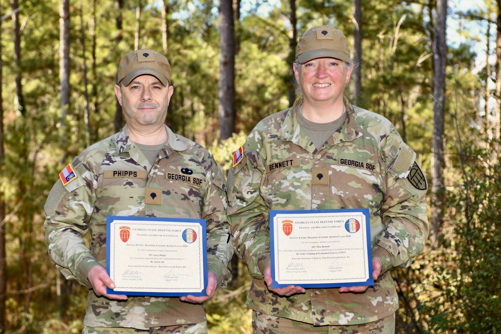 Georgia State Defense Force (GSDF) Initial Entry Training (IET) Alpha Class 26 graduates Spc. Gary Phipps (left), winner of the class leadership award and Spc. Elise Bennett (right), winner of the class academic award pose with their certificates after the IET Alpha Class 26 graduation ceremony, Ellenwood Readiness Center, Ellenwood, Ga., Jan 11, 2026.