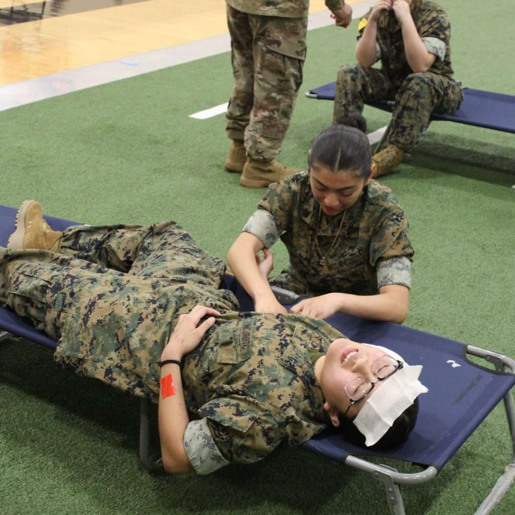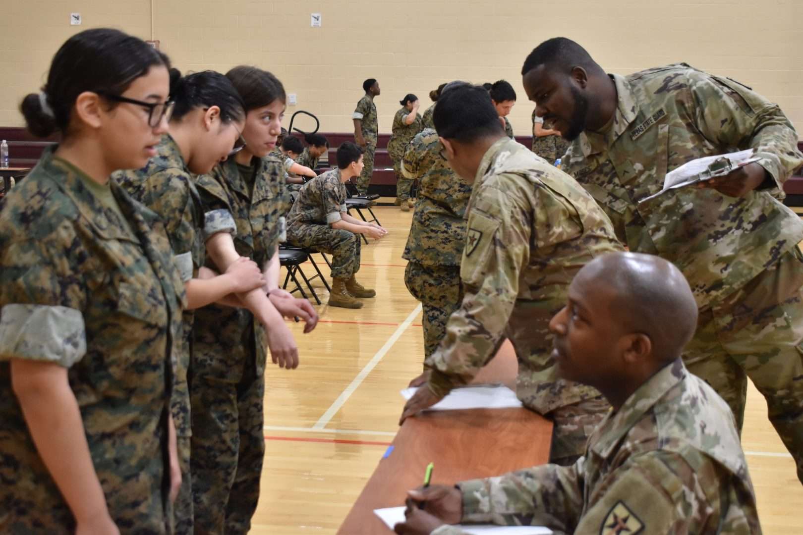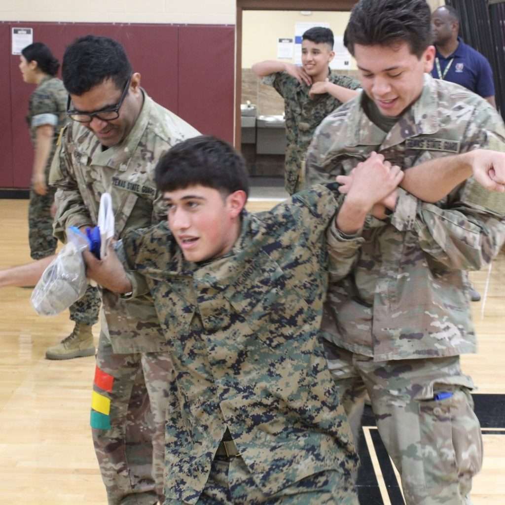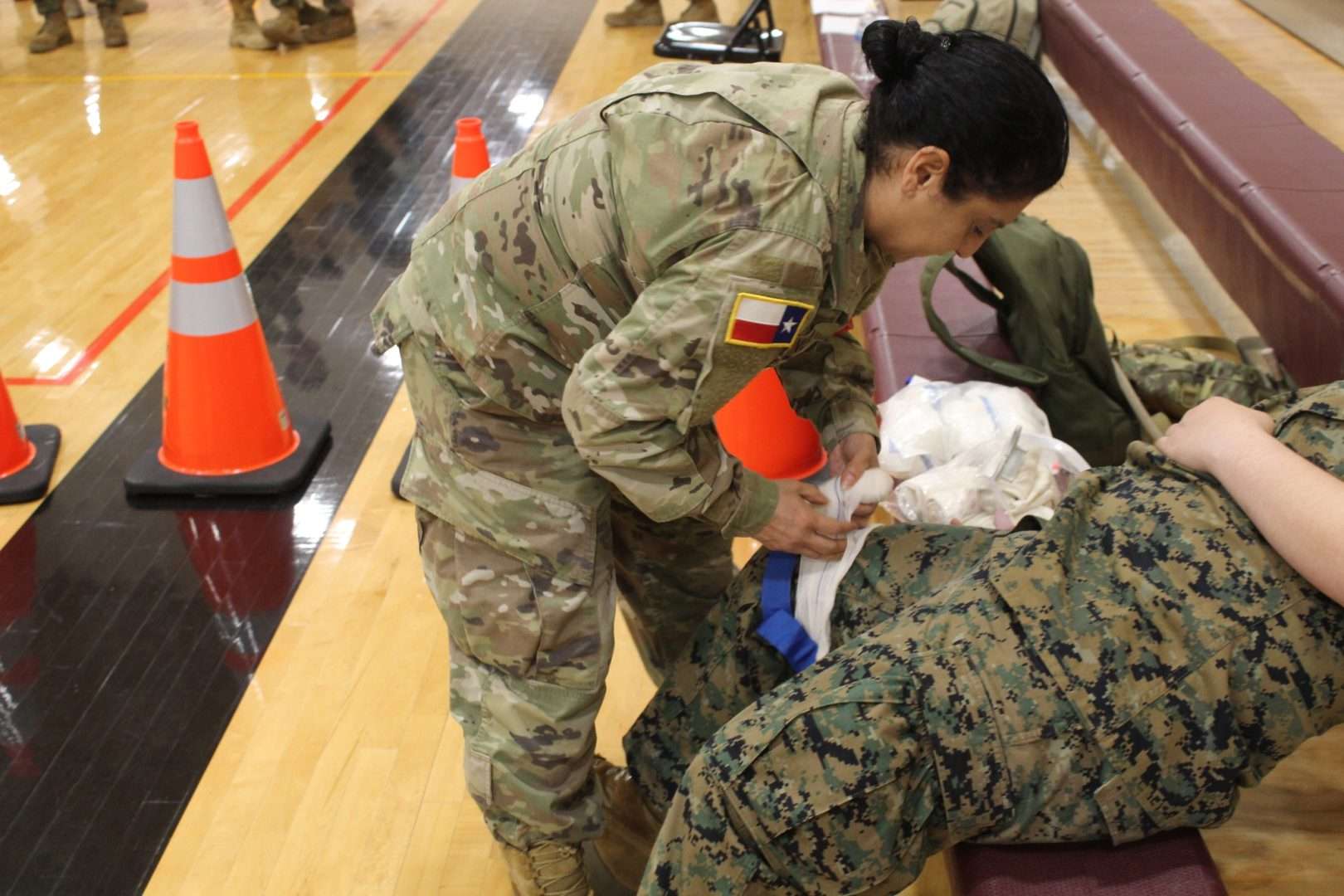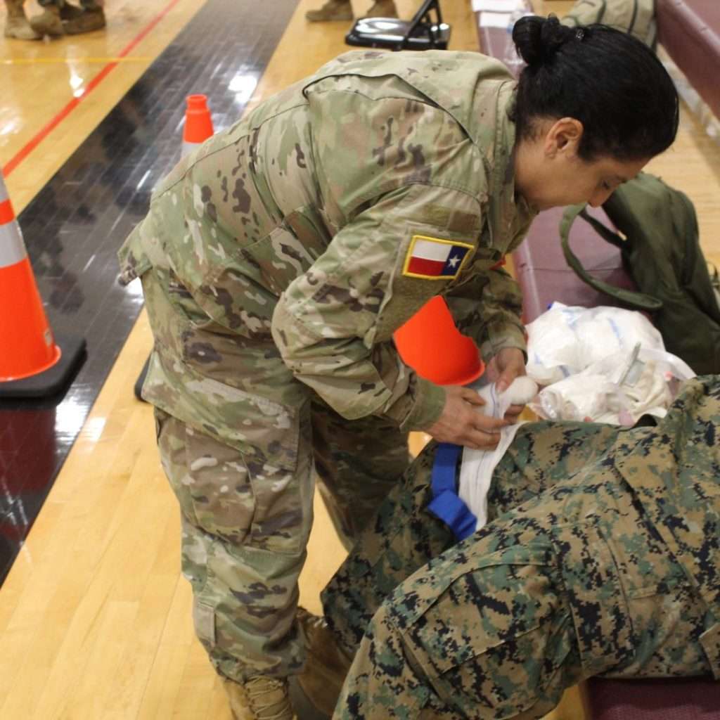 Guardsmen of 4th Battalion, 2nd Brigade, Texas State Guard, join with the Marine Corps JROTC Cadets of the International Leadership of Texas Katy-Westpark High School for a combined Field Training Exercise (FTX) simulating Shelter Operations, Mass Care Response and evacuation using the Emergency Tracking Network (ETN), Richmond, Texas, March 21, 2026. During the simulated emergency, organized and led by FTX OIC 1st Lt. Adriana Torres, Guardsmen honed their skills and shared their expertise with the cadets who stepped up to provide role players for each of the scenarios. Troops set up and operated a mock emergency shelter, responding to various situations from sudden illness to lost children to media visits. 1st Lt. Nicole Oulela led the mass care portion, briefing troops on triage and mass care techniques to efficiently provide first aid and medical evacuation. Chief Warrant Officer 2 Michael Farley, ETN Subject Matter Expert (SME) briefed the troops on the scenario and embarkation hub set up to facilitate an evacuation. All exercise portions were graded by an SME to evaluate mission readiness using the go/no-go system to ensure adherence to standards. This FTX prepares troops for more training and testing during AT next month, to be ready for hurricane season in June. A special thank you to cadets, OICs 1st Lts. Zayda Mendez and Julissa Gonzalez as well as U.S. Marine Corps Chief Warrant Officer 3, Franklin, Senior Marine Instructor. Well done all! (Texas State Guard photos by Chief Warrant Officer 2 Gregory Illich and Warrant Officer 1 Willie Grimes)