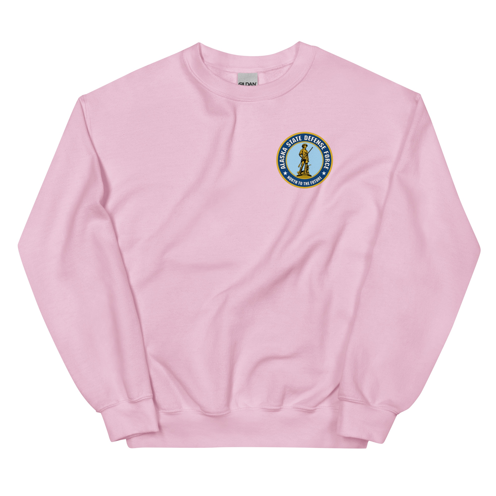 We designed a custom Alaska State Defense Force Sweater featuring a Gold & Blue Minuteman Emblem with The Alaska State motto embedded into it.
